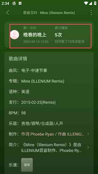 5、则会就可以看到屏幕上方有着这首歌的第一次听的时间和播放次数。