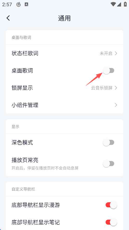 4、点击屏幕上方“桌面歌词”右侧的“开关键”。