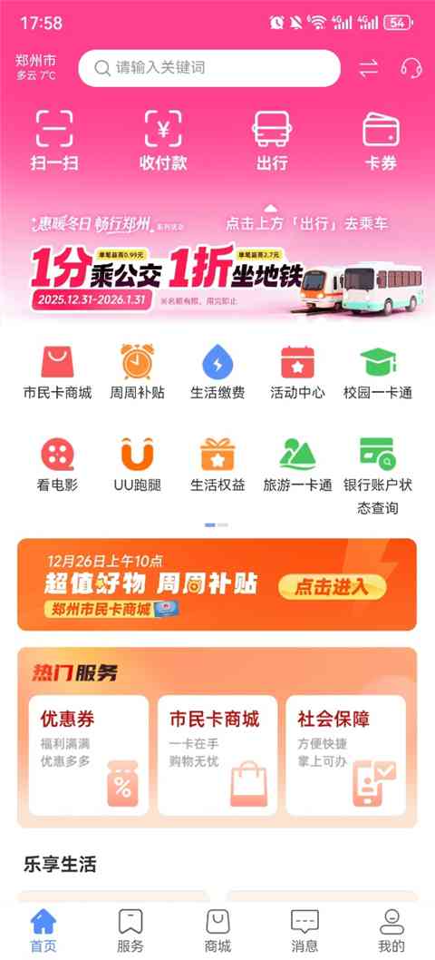 郑州市民卡App是专为郑州市民推出的一款集生活、 购物、出行为一体的综合性服务平台,它为郑州市民提供乘地铁、 痛并快乐着。 坐公交、打出租、叫跑腿、线上购物、文旅购票、汽车充电等各项便捷服务。
