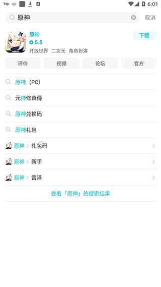 2、 接下来点击首页中右上方的搜索标志,输入游戏名称, 何不... 如原神,该游戏的相关信息就会显示出了。