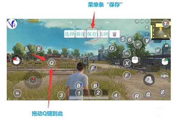 进入改键界面后拖动Q键的位置,并点击菜单条的“保存”按钮。退出改键位界面 点击“V3”悬浮球或点击菜单条上的“关闭”按钮或 手柄按Start键,键鼠按F1键。设置完成后即可退出自定义按键界面点击按钮退出。