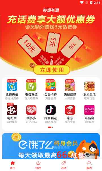 券想有惠, 一款能够让你购物更实惠的手机应用,它的到来无疑为消费者的生活带来了前所未有的便利。在这里 你可以轻松享受到超低优惠,购买各类优惠优质商品,还能进行各种软件的会员充值,纵享低折,购买更加优惠呃。现在就让我们一起来探索这款神奇的软件吧,蚌埠住了!!