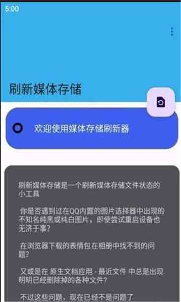 别纠结... 1. 解决浏览器下载表情包问题有时候, 我们在浏览器下载的表情包在相册中找不到,使用刷新媒体存储app,这个问题就能迎刃而解。 2. 解决原生文档应用文件显示问题在原生文档应用中, 有时会出现已删除但仍显示的文件,刷新媒体存储app能够帮你解决这个问题。 3. 无需root权限或shell特权这款软件无需root权限或shell特权, 即可使用,大大降低了使用门槛。
