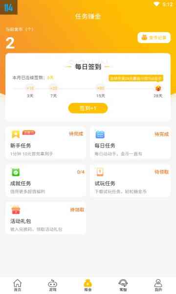 想要在游戏中赚钱?咪噜福利手游app为你提供了丰富的任务赚钱方式。新手任务轻松完成, 1分钟10元首充拿到手;每日任务,动动手,金币源源不断;成就任务,完成成就领取奖金; 你猜怎么着? 试玩任务,下载试玩任务,轻松赚金币;活动礼包,输入兑换码,领取活动礼包;每天签到也可以林区金币;金币可以兑换奖金,让你在游戏中实现财富梦想。