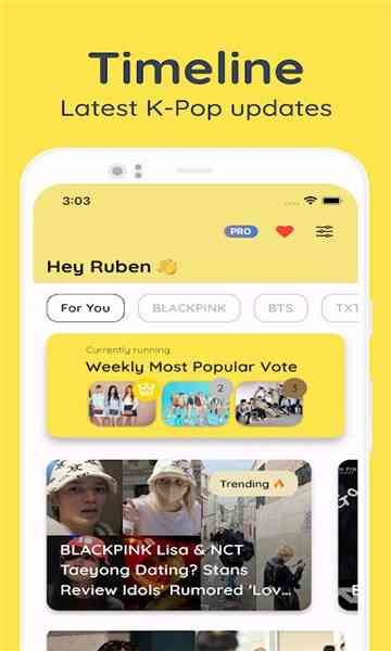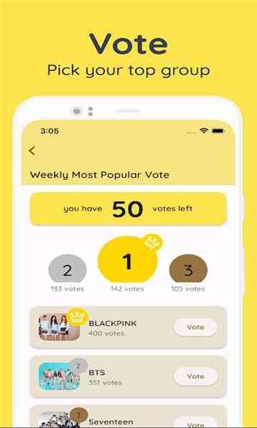 至于吗? 在我们的Kpoppo社区应用程序中为您最喜爱的K-Pop偶像投票,表达您对他们的热情。表达您的支持并帮助他们登上K-Pop排行榜的榜首。