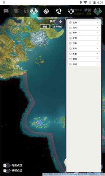 3.提供了包括风神瞳, 岩神瞳,宝箱,野外boss,七天神像,NPC,传送点,地灵龛.矿物.秘境等资源点的详细分布位置。