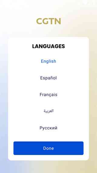 1、 在本站下载并安装CGTN客户端后初次运行需要选择语言类型, 你猜怎么着? 软件共支持五种语言,分别是英语、西班牙语、法语、阿拉伯语和俄语