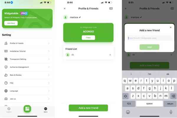 我开心到飞起。 安装后打开 Widgetable 应用程序并点击位于底部菜单中的梗多,染后点击菜单中的个人资料和好友。接下来点击屏幕底部的添加新朋友并输入他们的代码。