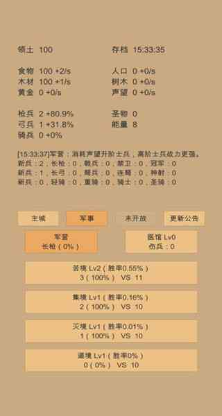 7、声望:苦、集、灭、道四境超过150级后产出,每高十级增加1/s,四境分开计算,用来升阶士兵,声望超过一百才会升阶,每次消耗当前1%进行升阶,纯正。