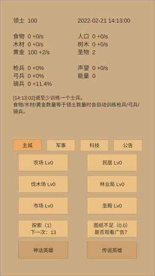 4、探索:每60秒增加一次探索次数,可以获得疆土和图纸,兵力越多,获得疆土越多