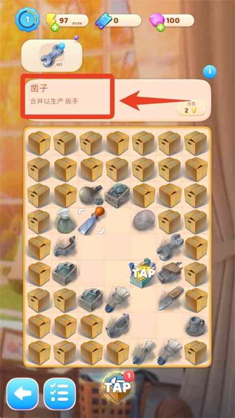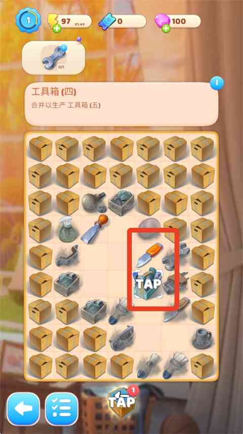 3、有灰尘的工具不能移动,只能被动合成。如果场上没有工具合成,可以点击工具箱来获得新工具。