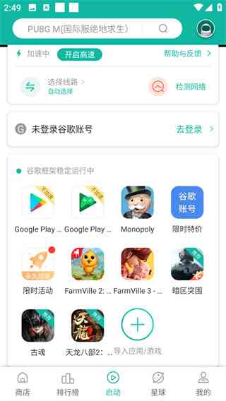 探探路。 1、 先说说下载安装好Monopoly 大富翁,然后再通过链接下载安装好ourplay加速器,打开加速器,进入首页,等待谷歌服务框架运行环境下载安装完成;