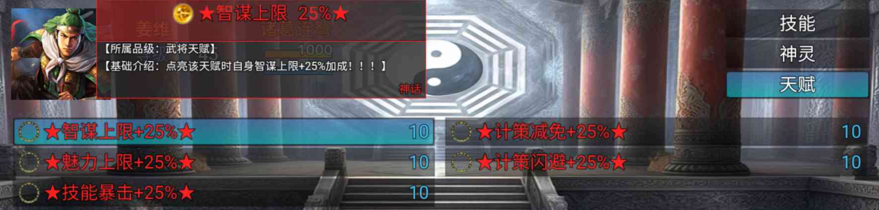 4、 天赋:智谋上限+25%计策减免+25%魅力上限+25%计策闪避+25%技能暴击+25%
