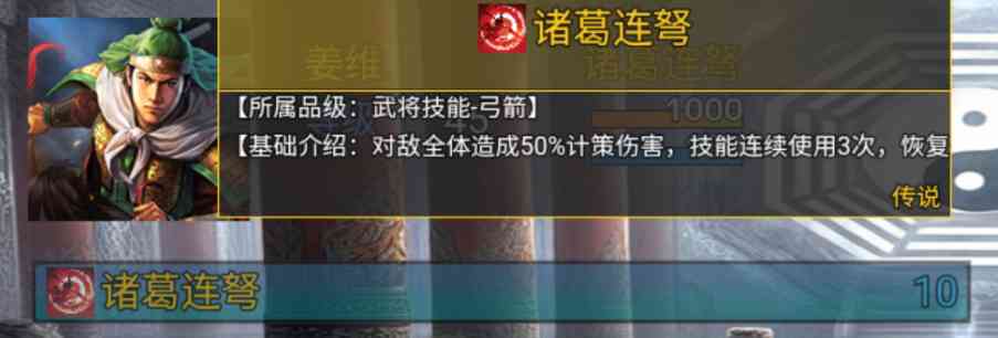 从头再来。 诸葛连弩:对敌全体造成50%计策伤害,技能连续使用3次恢复造成伤害兵力!