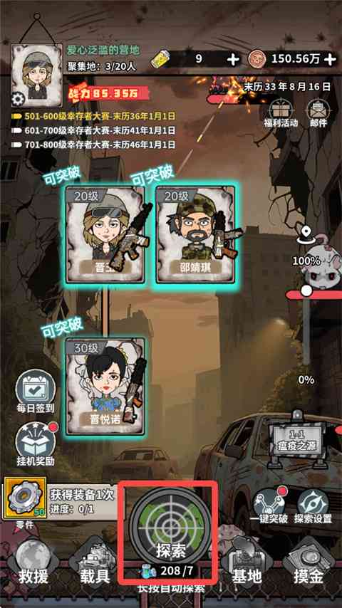 1、 进入末日大本营模拟游戏,点击,每次探索需消耗电池。