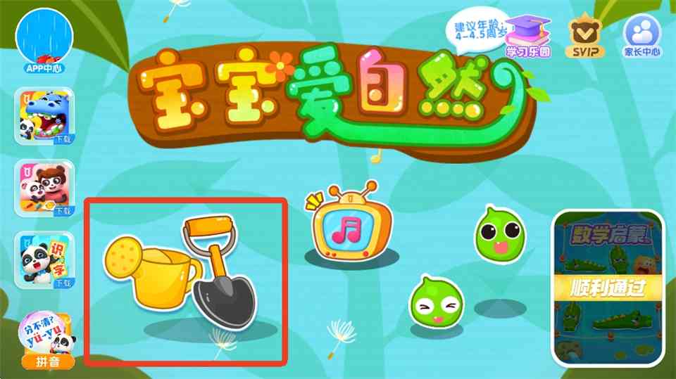1、打开宝宝爱自然游戏后点击第一个浇水壶和铲子,基本上...。
