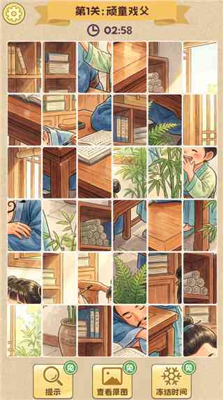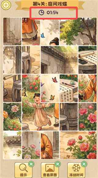 4、下方还为大家提供了提示、查看原图、冻结时间等道具,可帮助大家快速完成拼图,我傻了。。