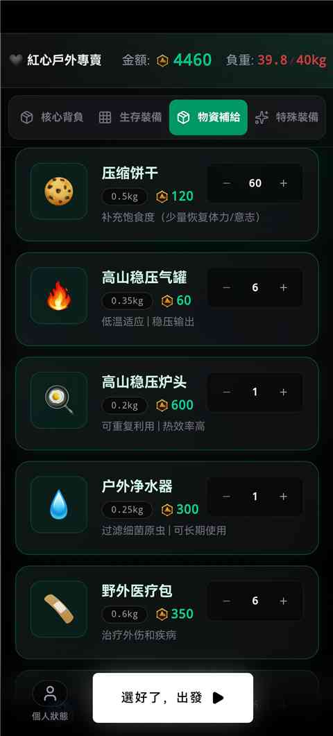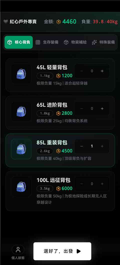 赛博徒步生死鳌太线是一款文字生存模拟手游, 以鳌太线为背景,玩家将成为一位穿越鳌太线的徒步者,在极端天气与饥饿状态情况下寻找生路。玩家开局会获得一定预算与负重上限, 需要前往商店购买背包、生存装备以及物资补给,在徒步过程中进行资源以及生命体征的管理,在资源消耗之前平安抵达终点或撤退。
