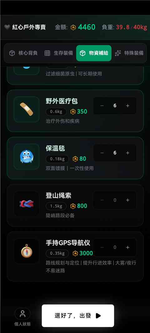 1、 进入赛博徒步生死鳌太线官方版游戏中,先说说在商店中购买装备和物资,选择好后就出发,谨记...。
