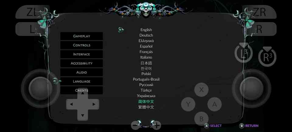 3、按向下键选中简体中文,按A键确定,后按B返回即可调整为简体中文