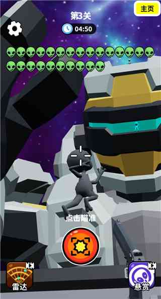 每关设倒计时,超时失败;需在限定时间内击杀所有外星人通关。