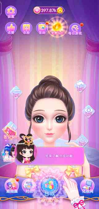 2、 点击“合成”,可以花费金币购买发型、眉笔、美瞳、腮红、口红,两个相同的类型可以合成高级装饰,提升自己美妆值。
