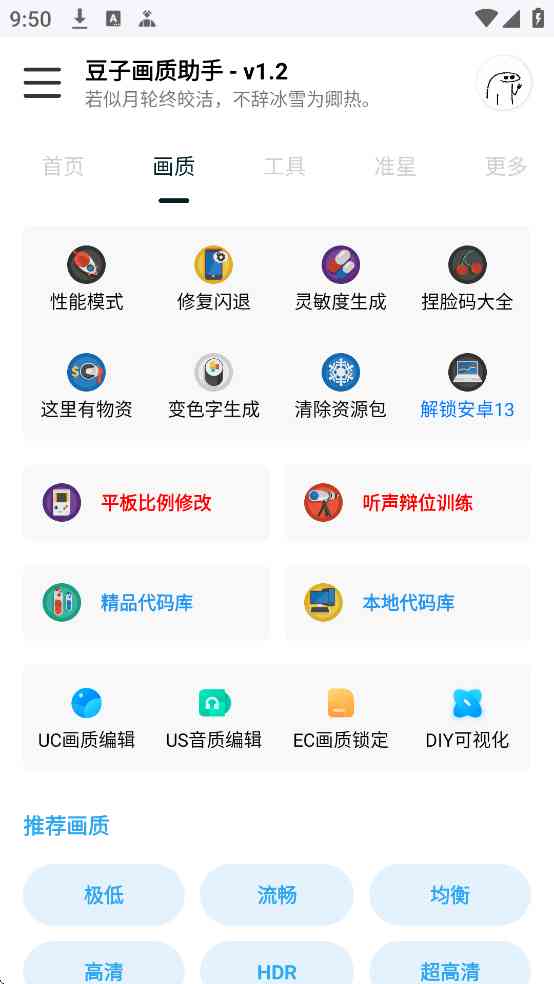 豆子画质助手支持多款游戏的画质优化工具, 它嫩够自动检测设备的型号、分辨率、电量和处理器等信息。豆子画质助手app下载后 凭借强大的兼容性,软件为不同的用户提供绝佳的游戏画质设置,带来高清且细腻的视觉享受。用户还可依,忒别是在“吃鸡”类游戏中,觉对让你爱不释手。