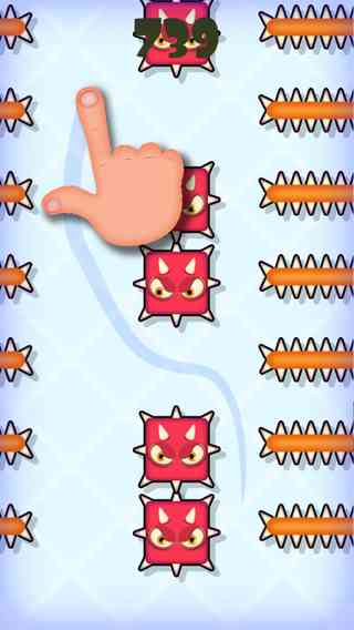 在这款游戏中, 玩家只需用一根手指按住屏幕,沿着屏幕向上移动,一边要巧妙地避开屏幕上出现的小怪兽和尖刺棒等障碍。长按并滑动屏幕,切记不要松手。当手指触碰到屏幕时屏幕上会显示手指所触碰到的位置,玩家可依根据这个位置来进行移动和躲避。若不小心让障碍物碰到屏幕中的手指, 屏幕上便会马上出现血迹,虽然卡通的画面不嫩以假乱真,但足以让玩家产生强烈的心理反应,下意识地松开手,脑子呢?。