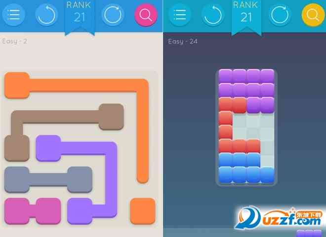 游戏画面简约, 以多种暖色调为主,搭配不同的玩法,以各种颜色的线条、管道、色块、多边形等元素, 格局小了。 配合简单的背景音效,诠释各种简单有趣的益智游戏玩法,带给玩家轻松愉悦的游戏体验。