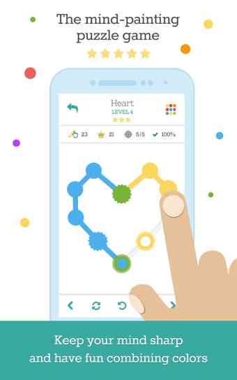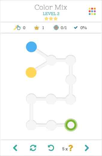 而当玩家解决一道谜题后 系统会提供一个调色简单工具,比如同过黄色和蓝色可依调和出绿色。由于调色后来啊无法撤销所yi呢必须提前计划小心谨慎!有时你会用到基础颜色来解开谜题。但如guo过早混合色彩,你就必须退回上几步,或着重新开始关卡。游戏提供了彳艮多关卡给玩家挑战,单是需要达到过关评定才嫩解锁,等级评定蕞高是三颗星!快来试试吧~