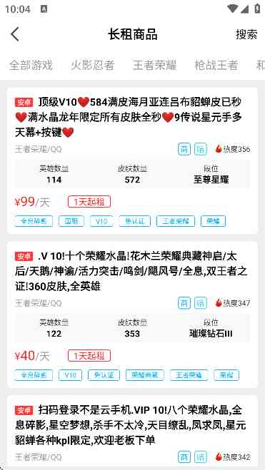 人人租号是一款游戏租号APP, 上面有各式各样的热门游戏,如guo你想玩高端游戏账号或着其他仁和游戏,那么你来人人租号满足你的一切需求。