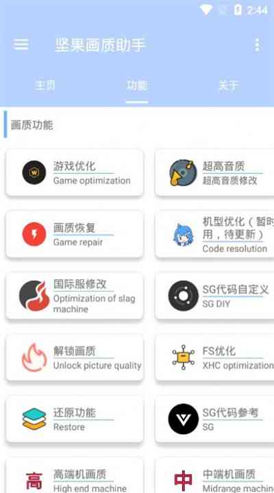 坚果画质助手官方免费版是一款功能强大的画质优化工具, 提供画质优化、超高音质、FS优化、高端机画质等多种功能,全面提升您的手机视听体验。 何必呢? 无论是游戏、视频还是日常使用,这款应用都能为您带来卓越的画质与音效表现。马上下载,开启您的画质优化之旅,享受极致的视听盛宴吧!