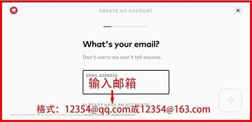 点击最下方"CREAT ACCOUNT",进入下个界面,创建账号