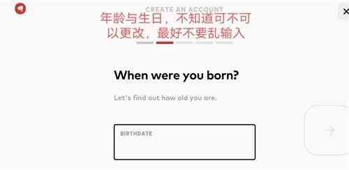 这一步主要是填写注册账号的出生日期,建议填一个自己可以记得住的,方便之后改密码或者找回账户,接着点右下角的红色"→",进入下一步。(最好选择2000年以前的,以免被当做未成年)