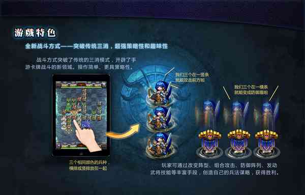 太虐了。 还有一些高级技巧, 一次行动一边组成两个或以上的阵列,就会奖励1点行动力,一次性组成的阵列每多一组,奖励的行动力就多1点,不论攻击阵列还是防御阵列。战斗中的武将和士兵一共有三种颜色,同色的攻击阵列在同一回合内发动攻击会按百分比增强攻击力。将已经在蓄力的士兵攻击阵列后面再组成一个同色的士兵攻击阵列, 后面的阵列就会和前面的阵列融合在一起,伤害翻倍。