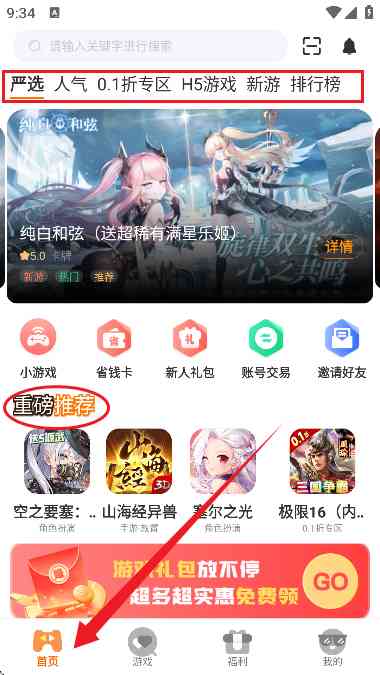 2、进入到软件首页,如图所示,这里能看到大量的热门游戏推荐。