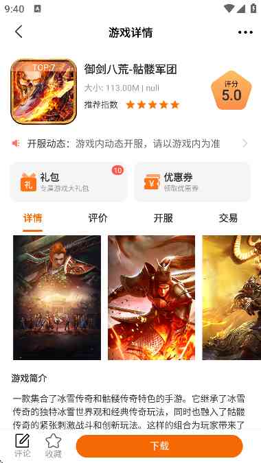 什么鬼? 3、 可以选择任意游戏点击其封面进入到游戏详情页,这里可以进行评论,收藏,和下载,可以查询游戏礼包,优惠券等信息。