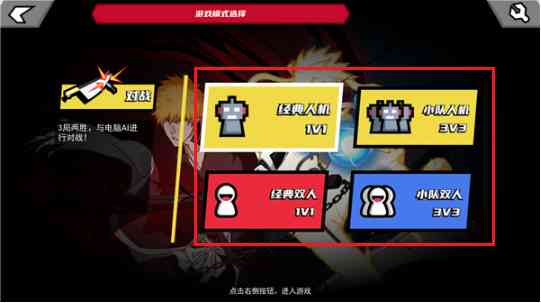 我懂了。 2、点击对战可选择经典人机、小队人机、经典双人和小队双人,人机对战三局两胜,与电脑AI进行对战;