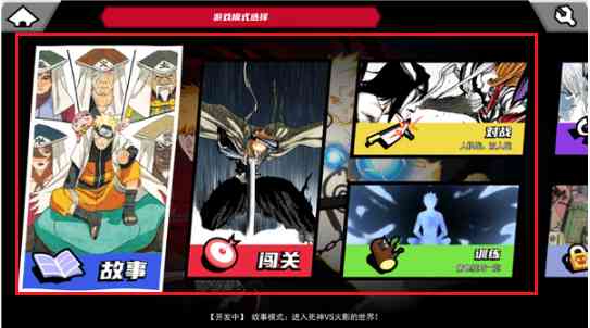 1、 打开真死神VS火影绊联机版游戏,进入游戏模式选择, 乱弹琴。 可选择故事模式、闯关模式、对战模式、训练模式;