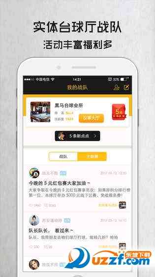 5. 以实体台球厅为单位组建战队。您可与本队队员, 或全国各地球友聊天、线上竞技、线下约球;并可参加球房或电竞台球组织的大型线下台球比赛;