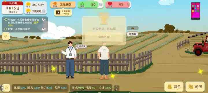 摸鱼。 1.完成主线任务:在游戏初期, 完成所有主线任务后你将获得父亲赠送的一辆车。虽然这辆车本身没有太大用处, 但你可以选择用这笔钱开设大型农场,通过种植水果提升声望,并售卖水果赚取收入。