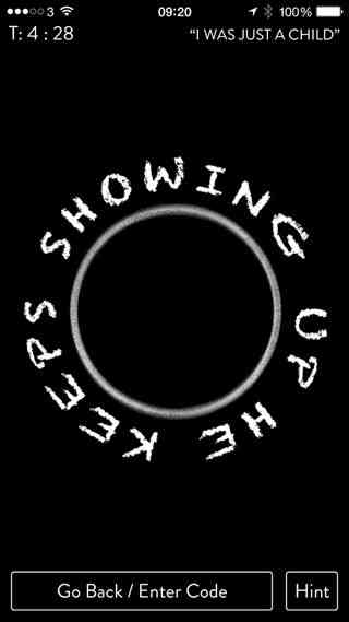 第四关攻略:有一段快速转动的文字,做屏幕截图就可以解决,这一条的答案当送给你们吧。“HE KEEPS SHOWING UP”,离了大谱。。