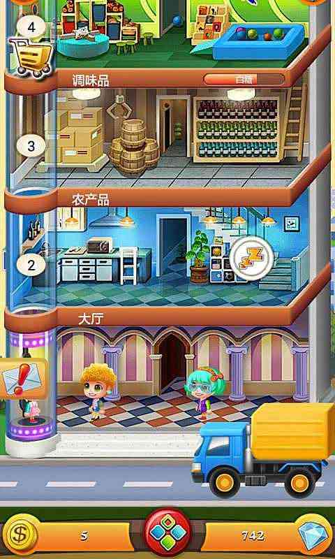 游戏中商铺主要的功能就是赚钱维持游戏的正常运营。商铺提供着各种各样的服务,比如教育类、母婴品、婚礼等,可谓是应有尽有,只有你想不到的。当然建造了商铺不代表就可以马上赚大钱了。玩家还需要分配从住宅里招来的人才, 根据人才的才能指示合理分配工作,工作的职责主要有三种,即管理、采购和销售。系统会不断地邮件通知,按照邮件的内容通过电梯送达到指定的居民手上就可以获得金币、货物等包裹。