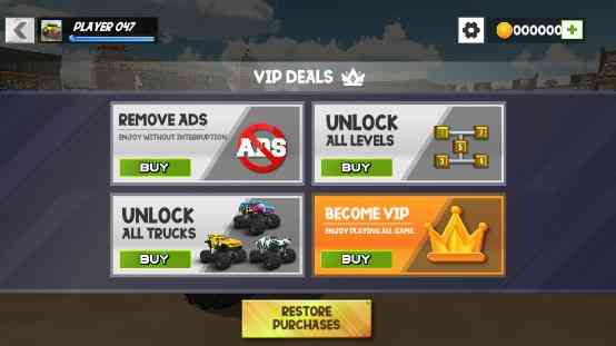 2、 玩家可以使用这些金币去购买道具,或者购买各种怪物卡车,如果你是一名汽车收集爱好者,还可以直接购买所有车型,简单来说...。