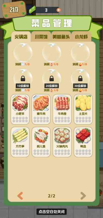 那么菜品升级也是可以让新地图快速解锁的方法之一。菜品在升级以后菜单的评价就会上升,上升到一定的等级后就可以让玩家的等级上升就可以解锁下一个店铺。 绝绝子! 在原本地图上所有的店铺后解锁新地图就会轻松一些。