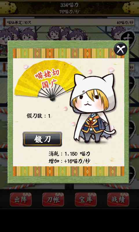 根据日本的人气手游《刀剑乱舞》所改编的一款游戏,是一款放置类休闲游戏。它不仅继承了原作的核心玩法, 优化一下。 更以全新的视角和角色,为玩家带来了不一样的游戏体验。游戏中猫咪们的活泼可爱,让人忍不住会心一笑。
