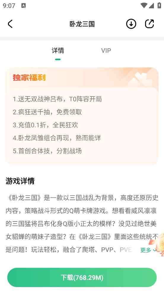 我始终觉得... 5、 在找到心仪的游戏后点击进入游戏详情页面这里会展示游戏的详情介绍、独家福利,截图、下载、版本信息等,帮助您进一步了解该游戏。