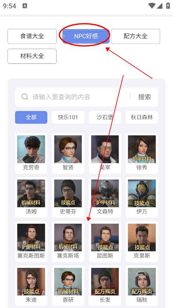 3、 进入图鉴后根据自己的需求选择不同的图鉴分类,如想了解NPC信息就点击“NPC好感”,想查看食材相关内容就选择“食材图鉴”等。