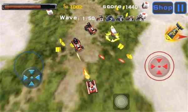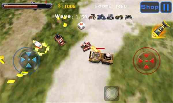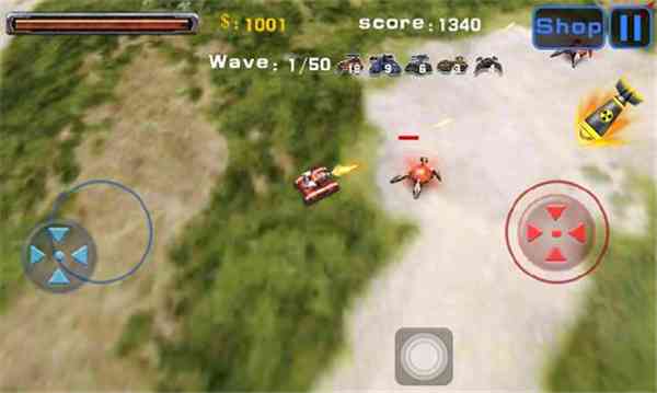 游戏的操作相对也比较简单, 坦克会自动攻击,通过右边的红色方向键可以手动控制炮台的方向,而位于游戏界面左边的蓝色方向键则是用来控制坦克移动的方向,探探路。。