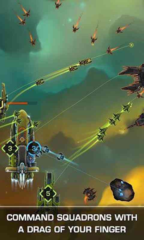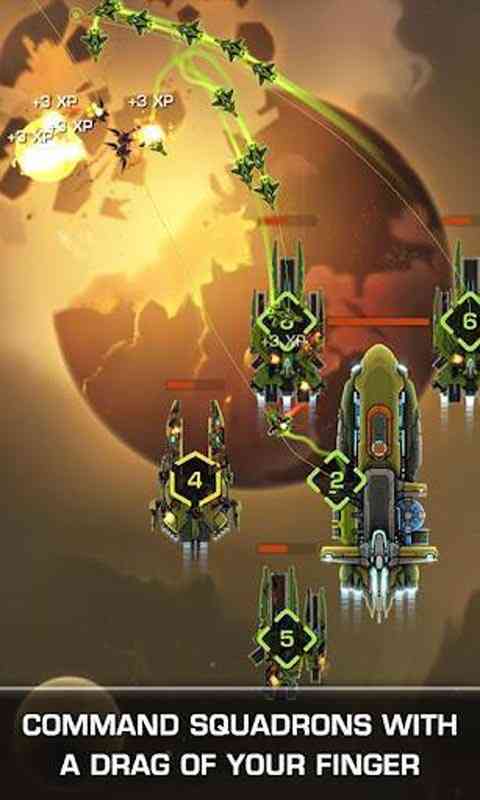 拯救一下。 操作方面很简单, 选中并拖拽要出击的舰队至敌人位置,舰队上的飞船就会沿着所画路线来回飞行并对范围内的敌人进行攻击。战舰上的数字代表携带飞船的数量,飞船被击毁时可以因为时间重生。由于敌人的攻击方向各异, 所以呢你需要根据战局的变化不断地移动你的飞船,这种操作方式很像即时战略的模式,而实际游戏中你也会找到玩星际的感觉。